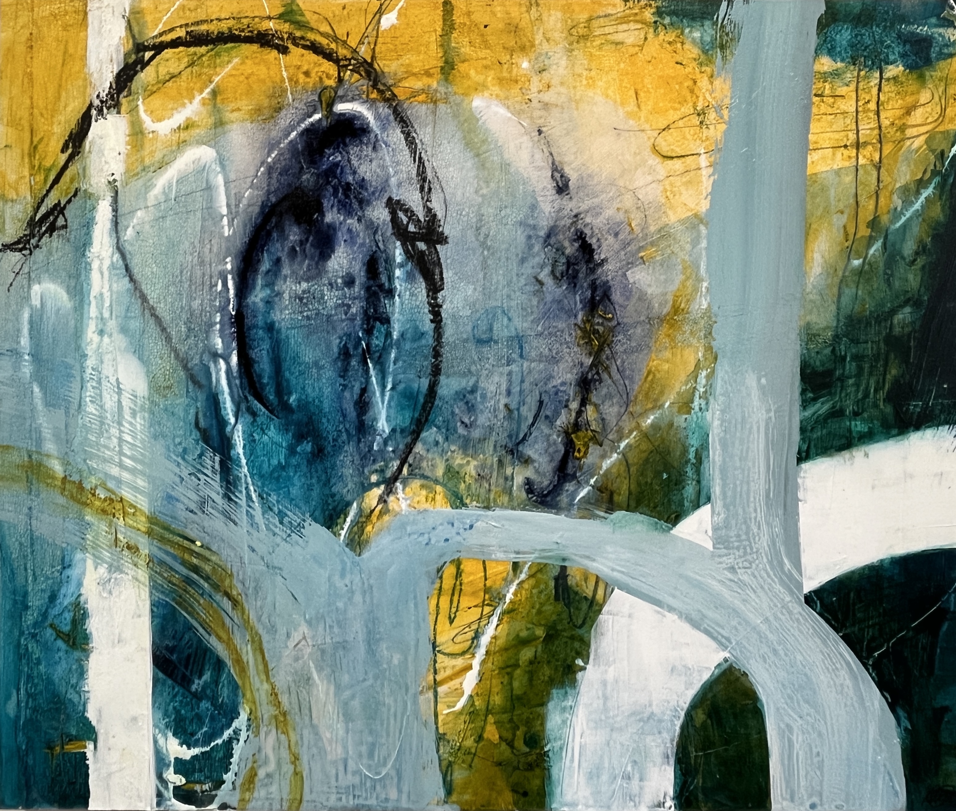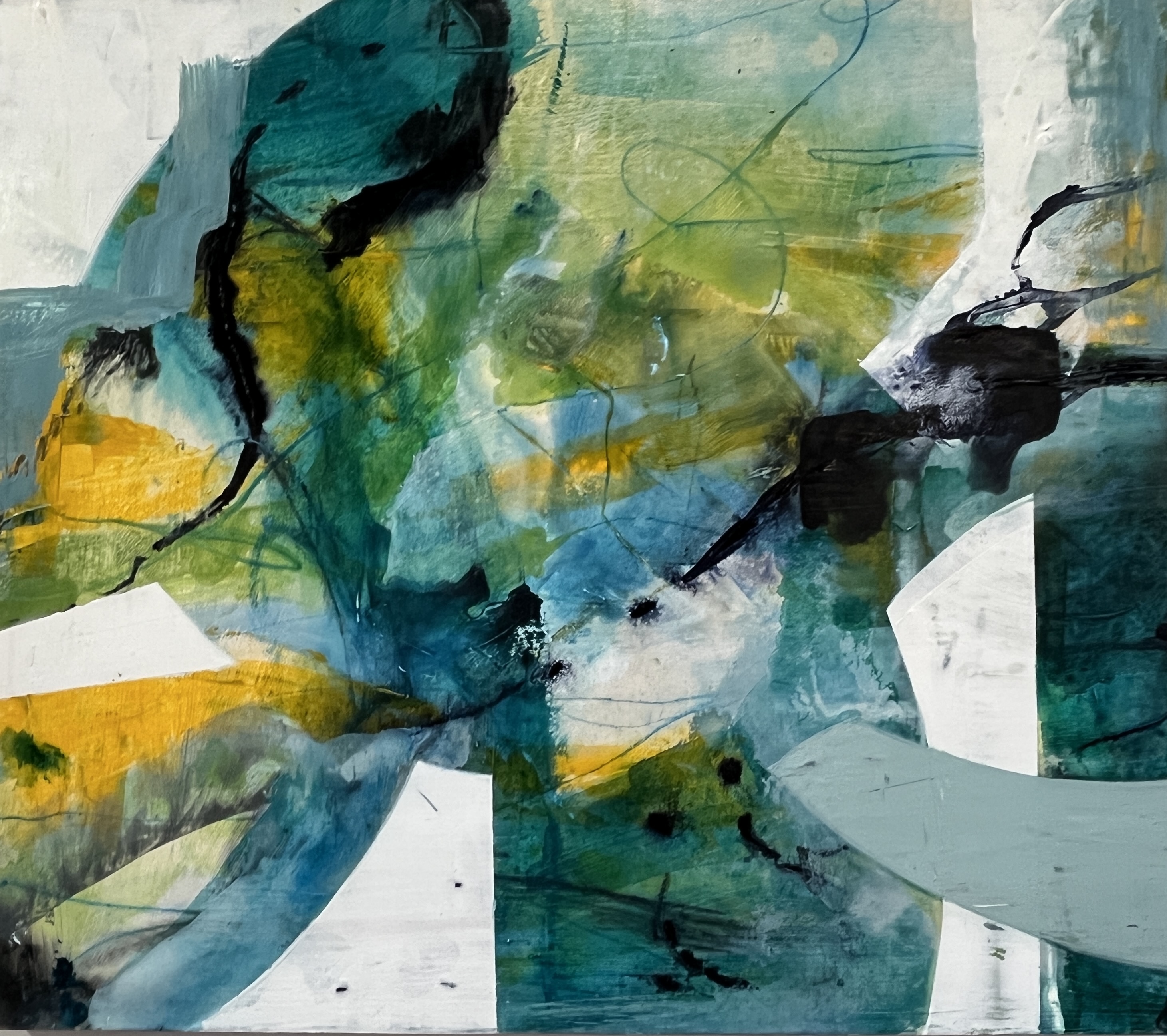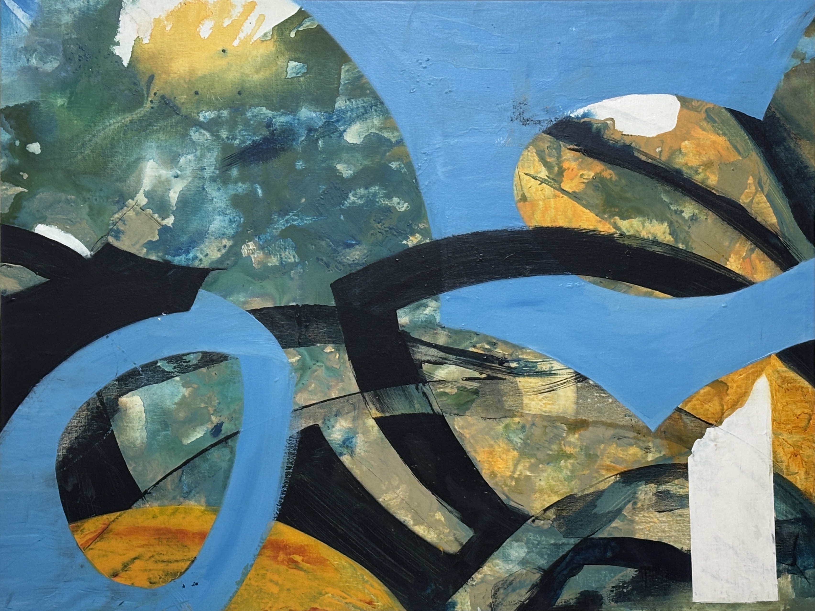 I några av målningarna, framförallt de större målningarna har det kommit fram en känsla av kartor, av in och utzoomning, av att försöka hitta en väg, ett nyläge i den turbulenta värld vi befinner oss. De handlar om navigering/orientering kanske knappt ens om rörelse, utan att finna fast mark under fötterna i en osäker och föränderlig värld. Framförallt i akryl på duk/pannå.