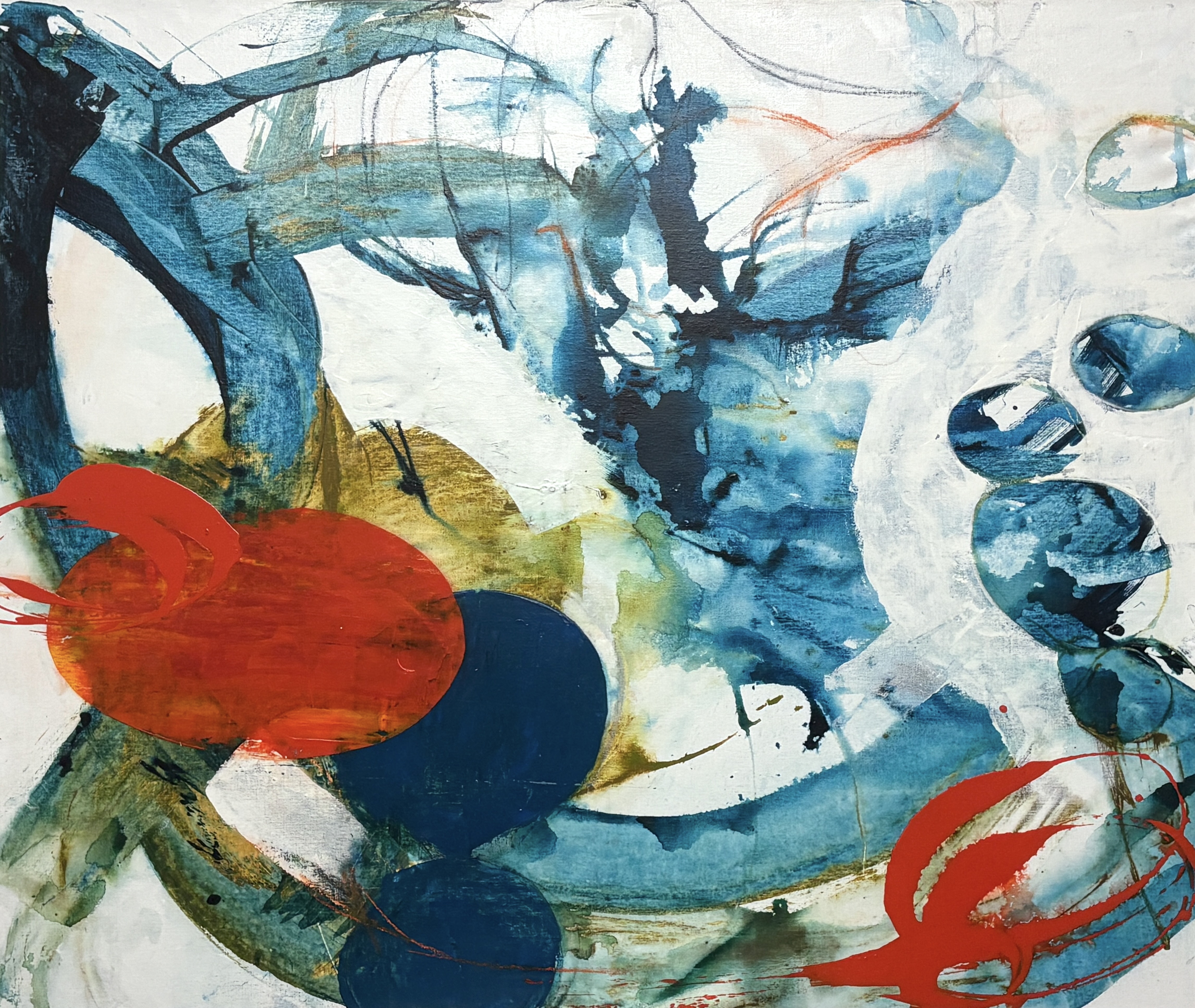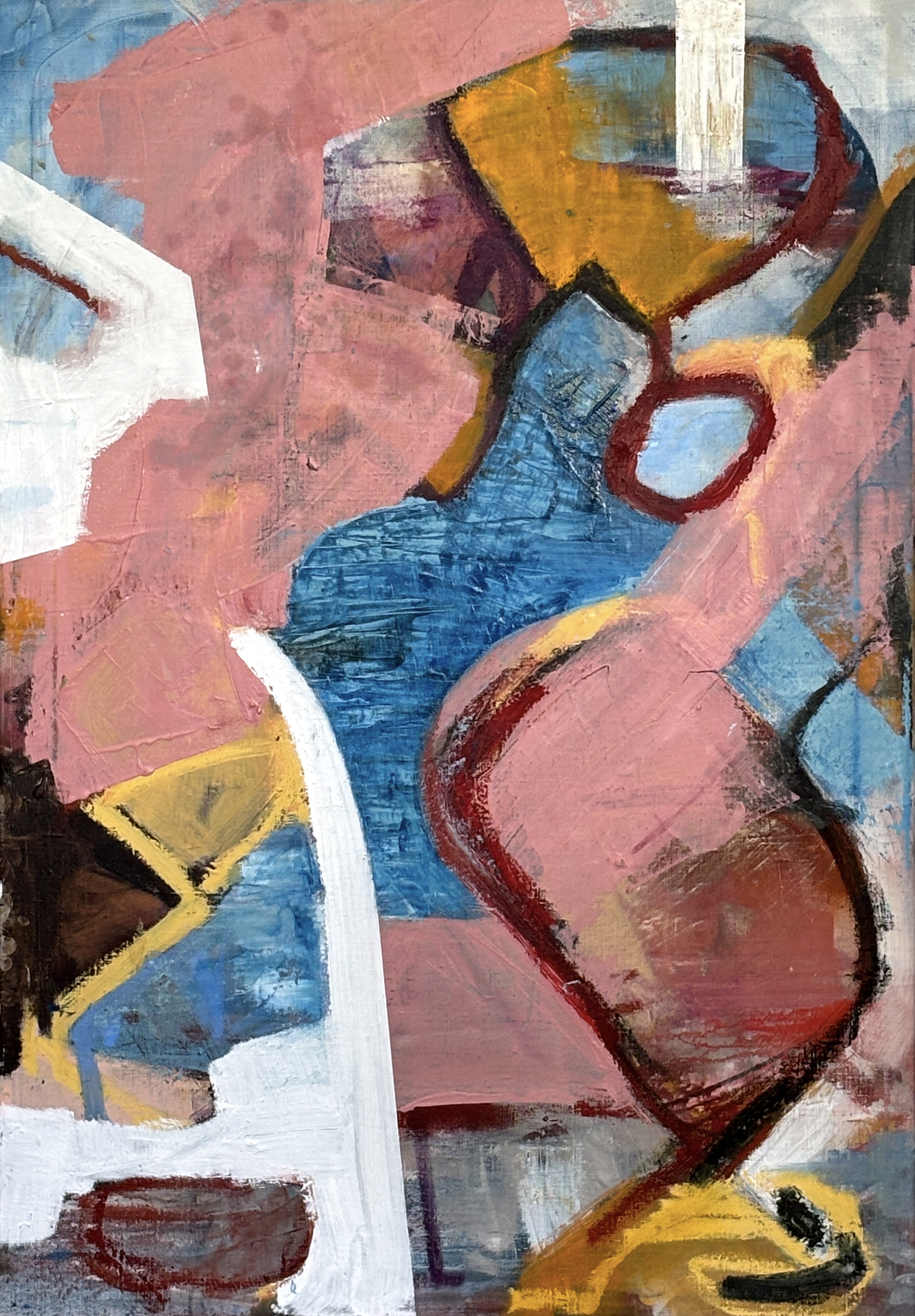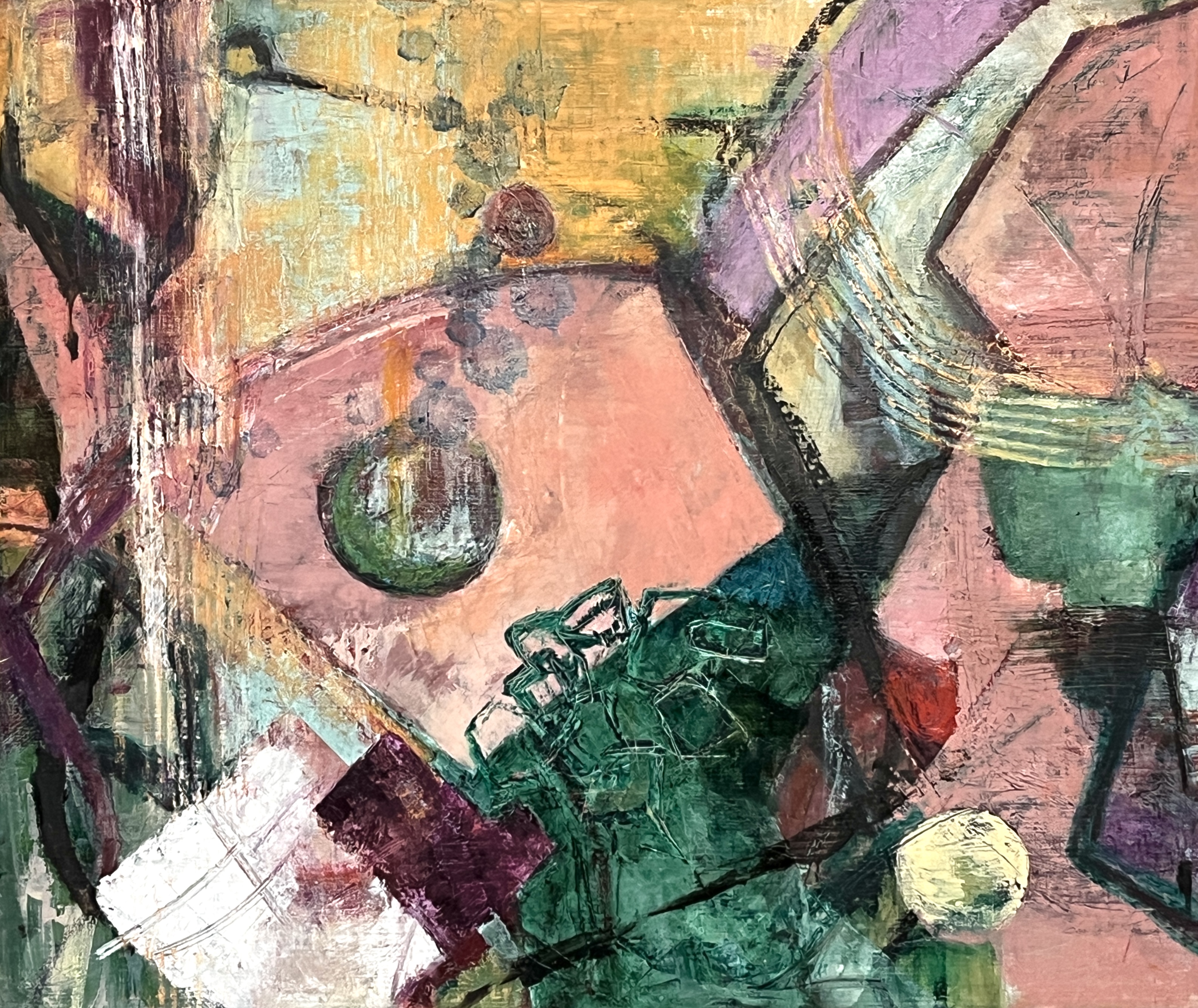 I andra är utgångspunkten i den fragmenterade världen vi har, alla olika perspektiv, längtan efter en helhet när det mesta känns/är trasigt. Dessa är i olja och har ett annat uttryck med tydliga tyngre färgfält.