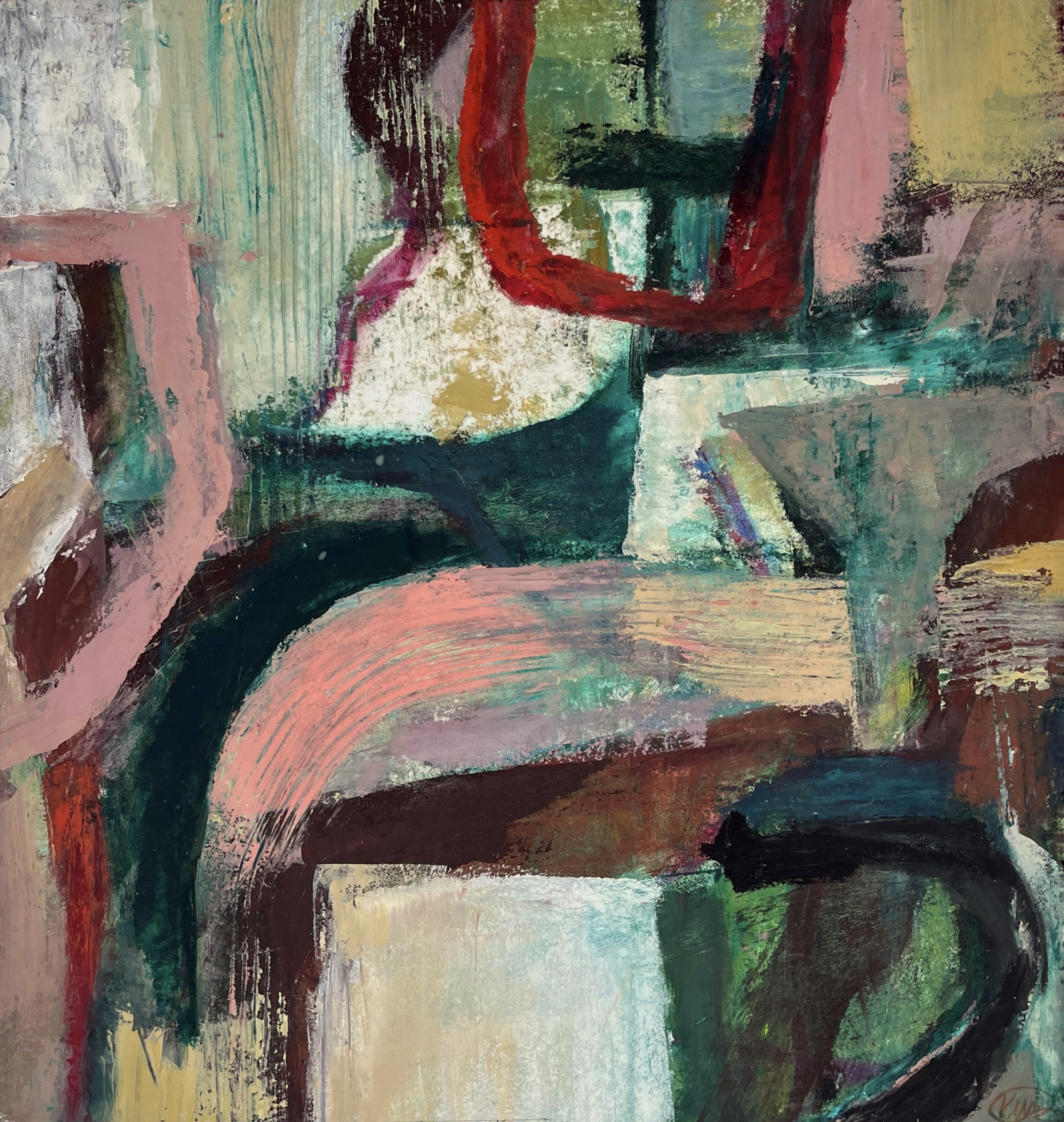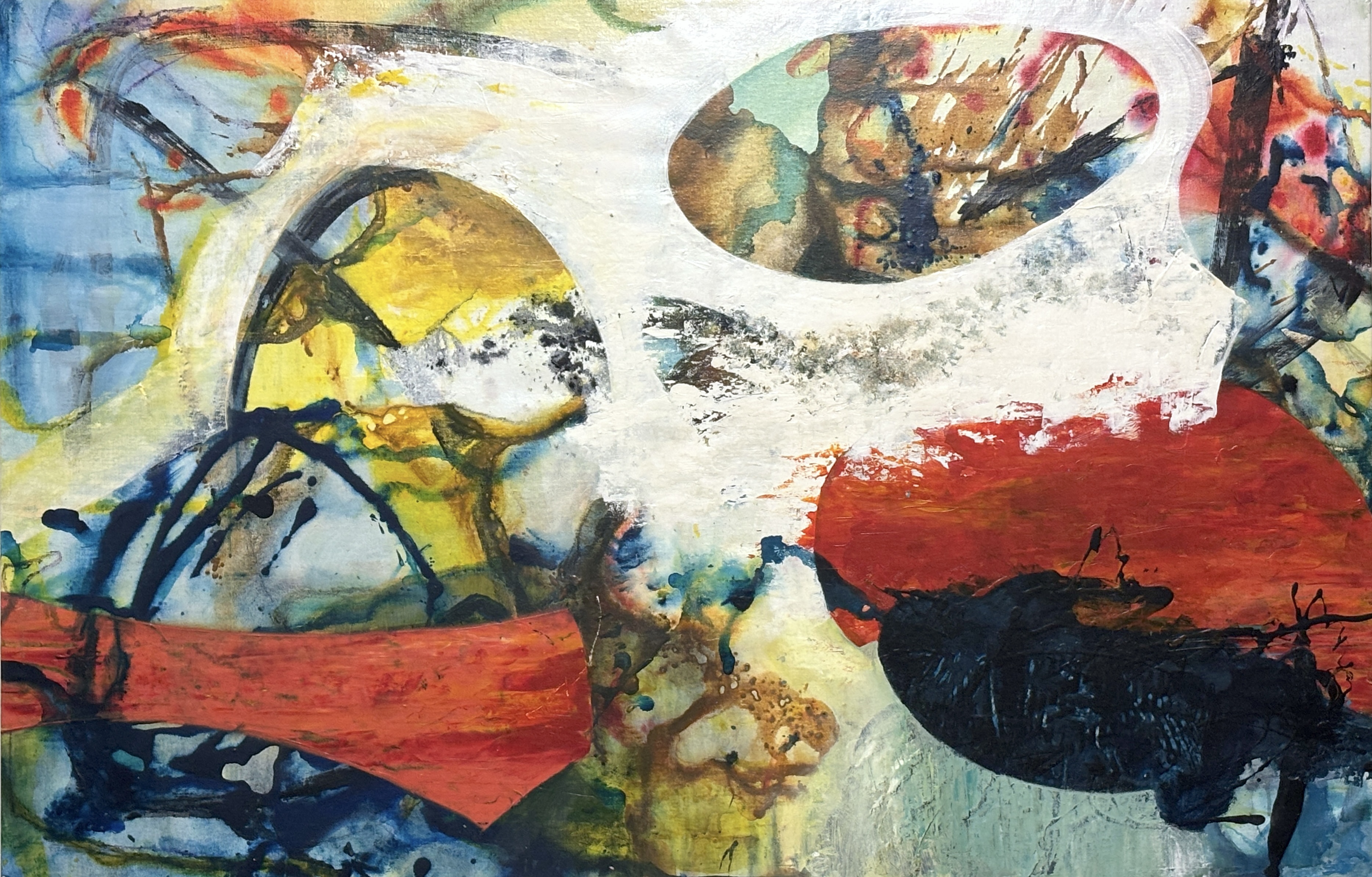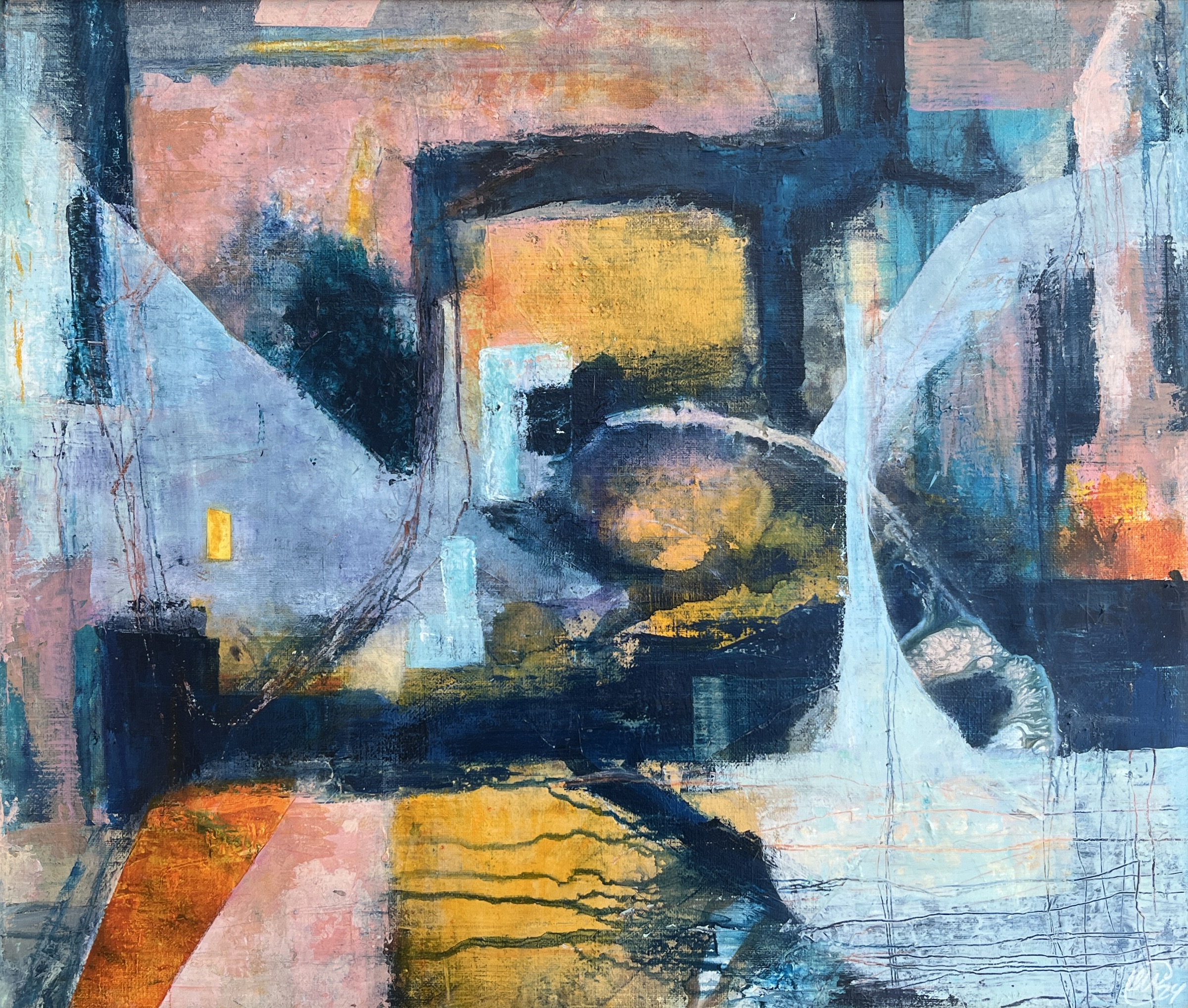 I andra är utgångspunkten i den fragmenterade världen vi har, alla olika perspektiv, längtan efter en helhet när det mesta känns/är trasigt. Dessa är i olja och har ett annat uttryck med tydliga tyngre färgfält.