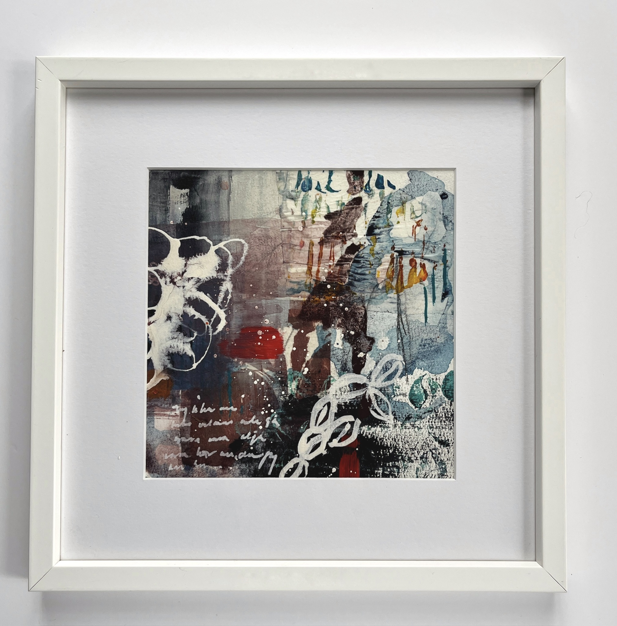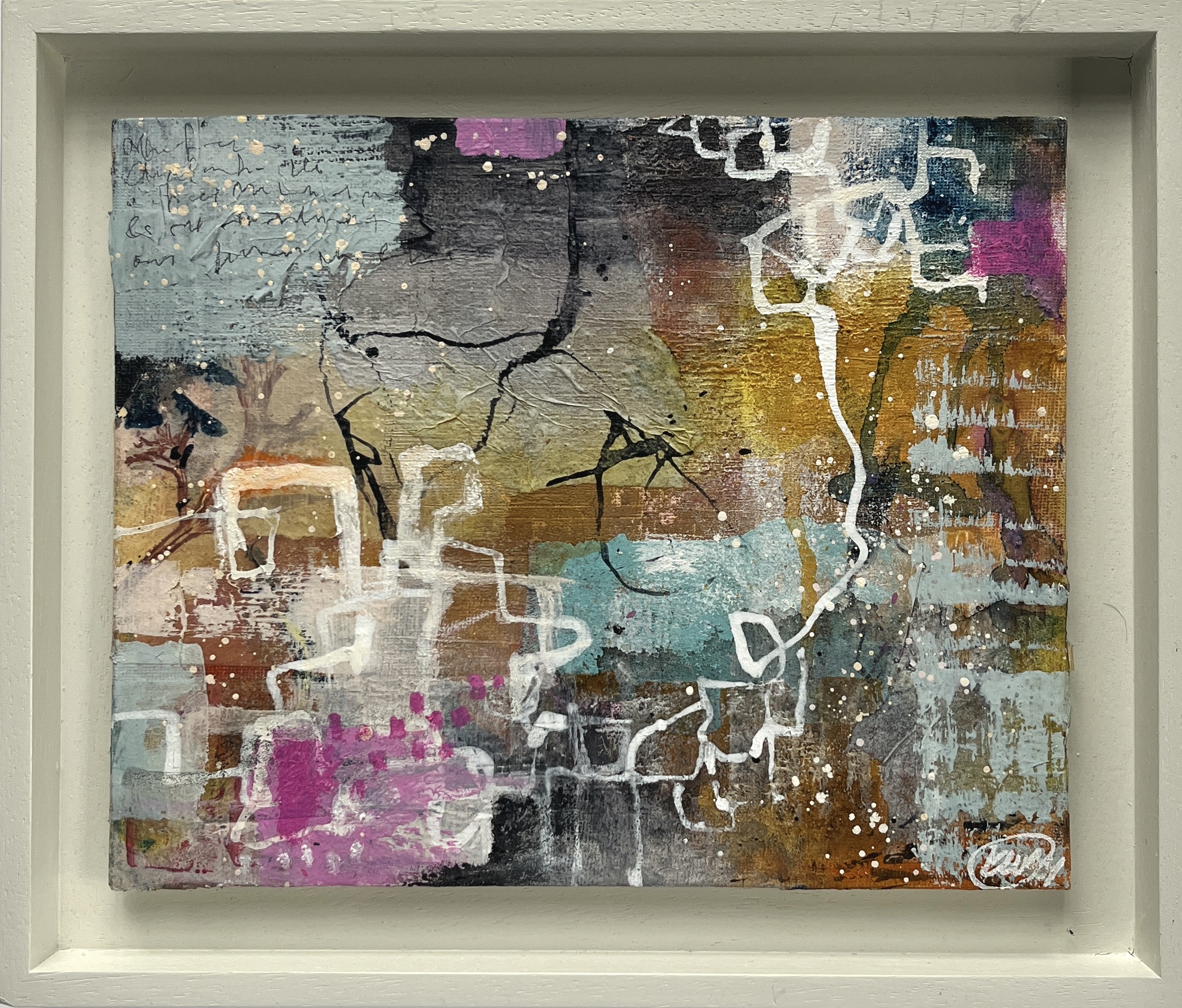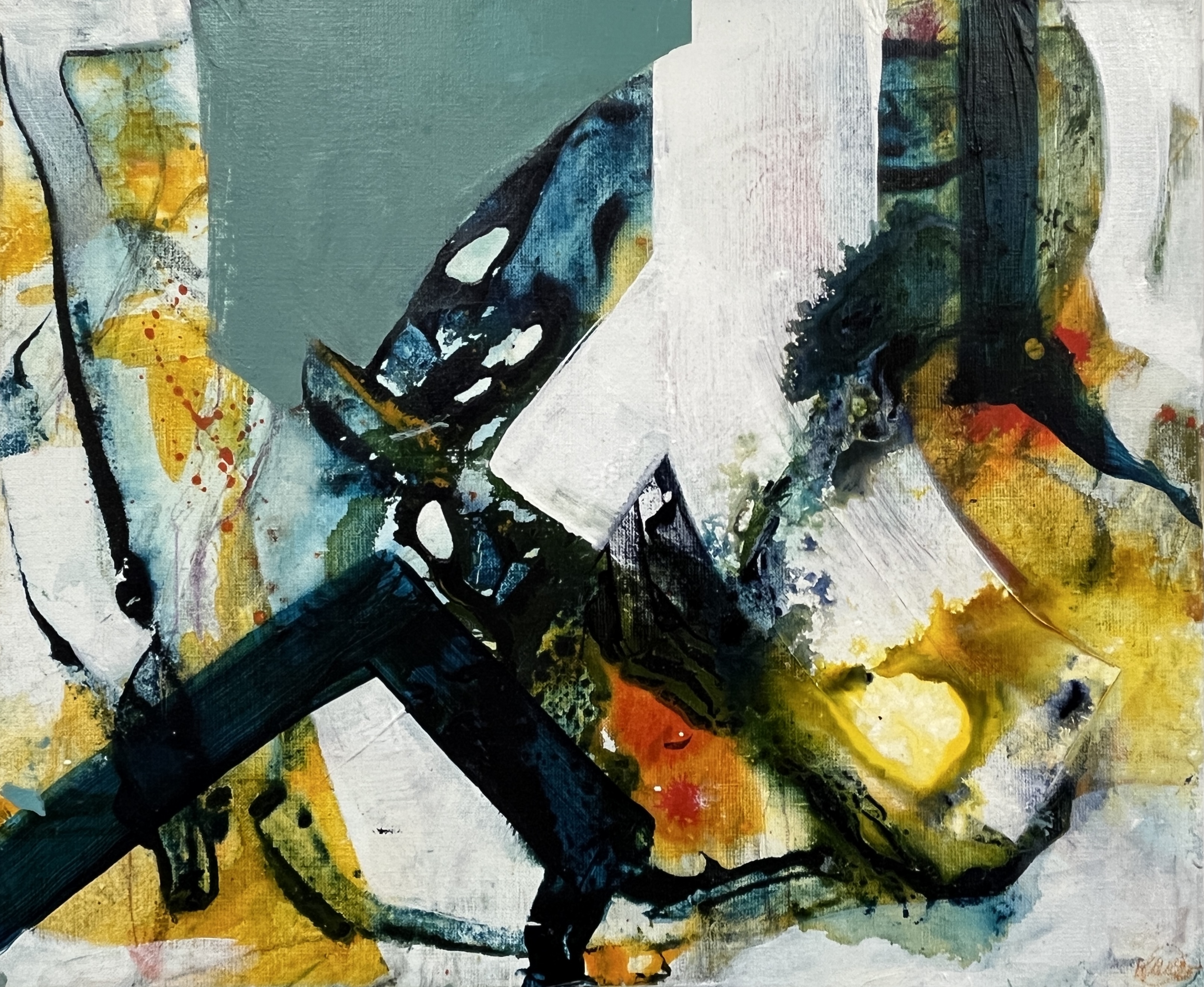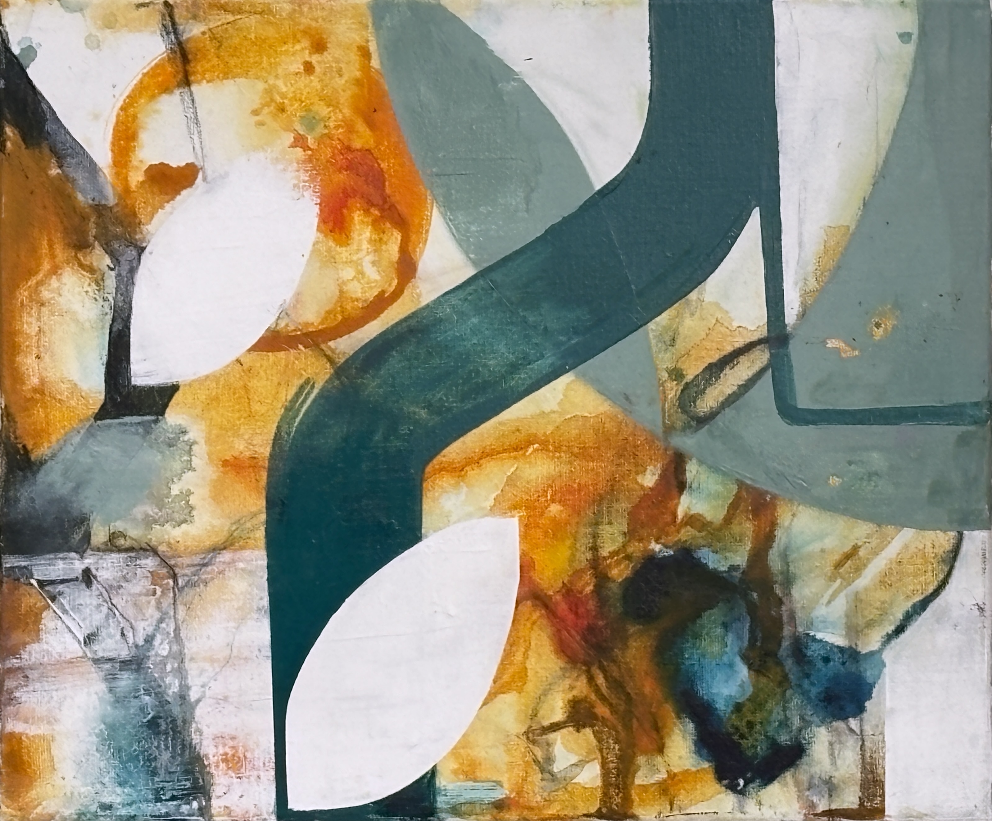 I några av målningarna, framförallt de större målningarna har det kommit fram en känsla av kartor, av in och utzoomning, av att försöka hitta en väg, ett nyläge i den turbulenta värld vi befinner oss. De handlar om navigering/orientering kanske knappt ens om rörelse, utan att finna fast mark under fötterna i en osäker och föränderlig värld. Framförallt i akryl på duk/pannå.